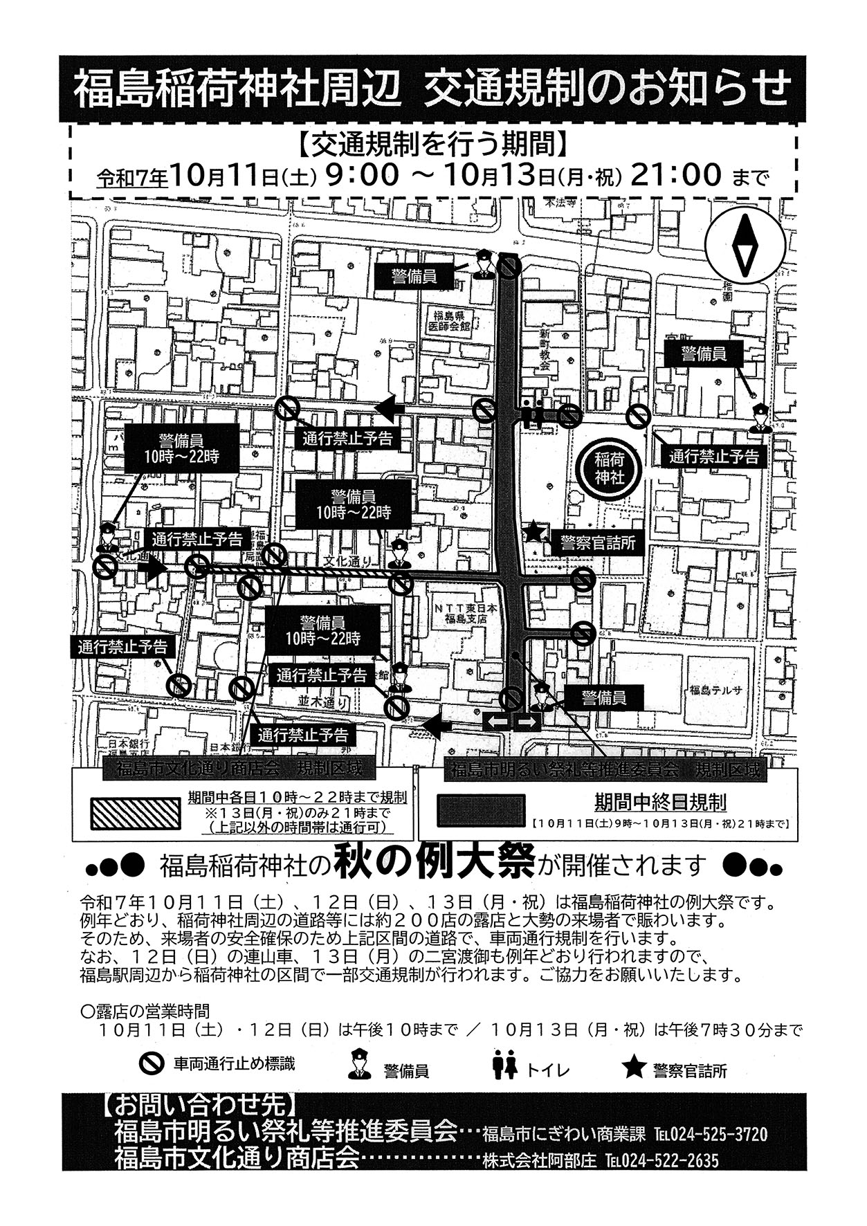 ★露店(200店超) 11~13日 また例大祭期間中の3日間は、露店開催のため、 加えて、交通規制区間(※下記参照)もありますので |
